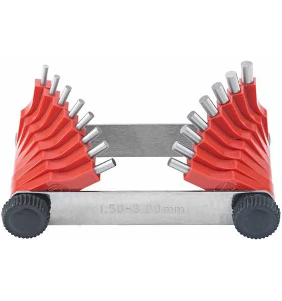 Mit Stahlstiften, in Kunststoff gefasst. Schale aus Stahl. Für Messungen aller Düsenarten und kleiner Bohrungen.