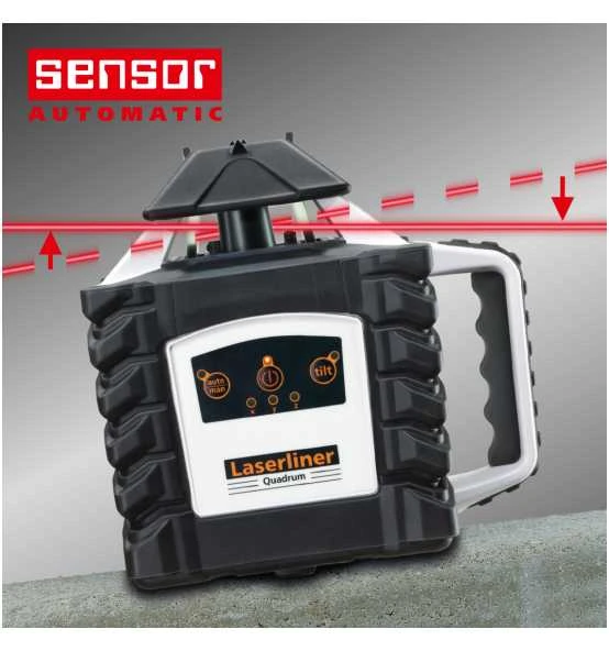 Der Quadrum 410 S ist ein vollautomatischer Rotationslaser für die exakte Ausrichtung von Horizontalen und Vertikalen. Durch die extra lange Empfangseinheit ist der Laserempfangsbereich mit einem Radius von 400 Metern extrem groß. Mit der Fernbedienung können die Funktionen bis maximal 40 Metern von allen Seiten komfortabel gesteuert werden. Bei Fremdeinwirkungen erfolgt eine automatische Abschaltung.