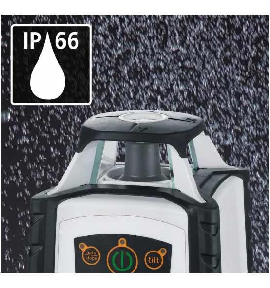 Der vollautomatische Rotationslaser mit großer Reichweite ist ideal für Aushub- und Ausschachtungsarbeiten. Das robuste Gerät ermöglicht ein genaues Nivellieren von Horizontalen und Vertikalen. Ein 90° Referenzstrahl dient dem Loten und Ausrichten von Trennwänden. Die grüne Lasertechnologie sorgt für eine exzellente Sichtbarkeit. Zu den verfügbaren Modi zählen der Punkt-, Scan-, Rotations- und Handempfängermodus. Neigungen lassen sich manuell anlegen. Die Kombination aus Leichtstativ, Laserempfänger und Messlatte ist optimal für das Festlegen und Arbeiten mit Referenzmaßen. Neigungen lassen sich manuell anlegen. Per Fernbedienung können alle Funktionen bis maximal 30 Metern komfortabel ferngesteuert werden. Bei einer Fremdeinwirkung erfolgt die automatische Abschaltung zur Verhinderung von Fehlmessungen. Durch paralleles Arbeiten und Laden des Akkus verliert der Anwender keine Zeit bei seiner Tätigkeit.