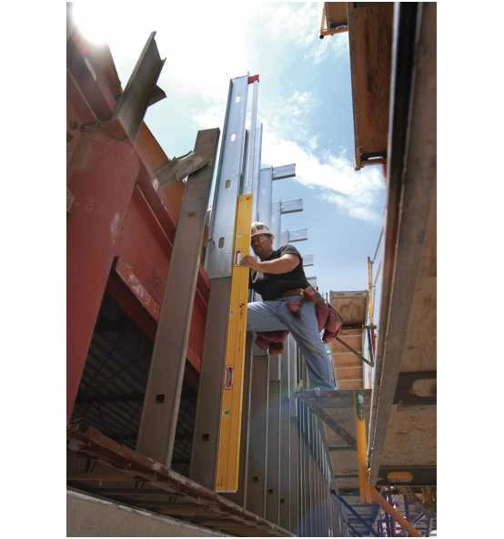 Ausziehbare Wasserwaage mit stabilem 3-Kammer-Aluminium-Rechteckprofil und extrastarkem Seltenerd-Magnetsystem zur optimalen Haftung an metallischen Bauelementen freie Hände beim Ausrichten und Justieren von Pfosten und Trägern